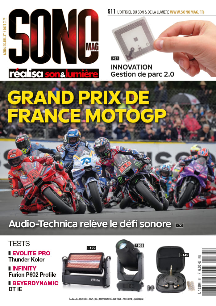 SONO Mag #511Grand Prix France moto GP, Audio-Technica relève le defi sonore – Salle Pleyel, sentinelles d’un soir – Prestataire son & lumière, DSE – le SAV RCF en France – Premiers pas vers l’immersif #4 – Strobe-Wash,  Evolite Pro Kolor – Lyre, Infinity Furion P602 profile, etc.